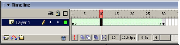Timeline-এ 2 থেকে 29 নম্বর ফ্রেমের মধ্যে একটি তীর চিহ্ন দেখা যাবে (শুরু থেকে শেষের দিকে মুখ করা) এবং ফ্রেমগুলোর কালারও পরিবর্তিত হয়ে যাবে।